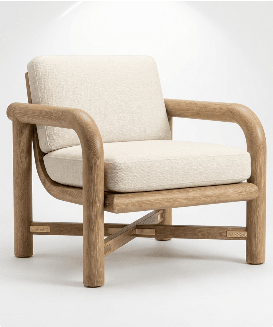 Lounge armchair with chunky cylindrical solid wood frame members in cerused white oak with pronounced open grain texture. The arms are thick sculptural rounded bars that curve continuously from the backrest forward and downward, wrapping around the seat in a protective cradle. Unlike a fully enclosed form, the frame is open and structural beneath the seat — an exposed cross-brace stretcher system connects the four legs with visible brass flat-bar hardware at each joint. Separate loose seat and back cushions in cream herringbone-weave performance fabric sit within the frame, elevated slightly off the base to reveal the wood-and-brass joinery underneath. The chair balances substantial sculptural mass in the upper frame with an open, airy lower structure.